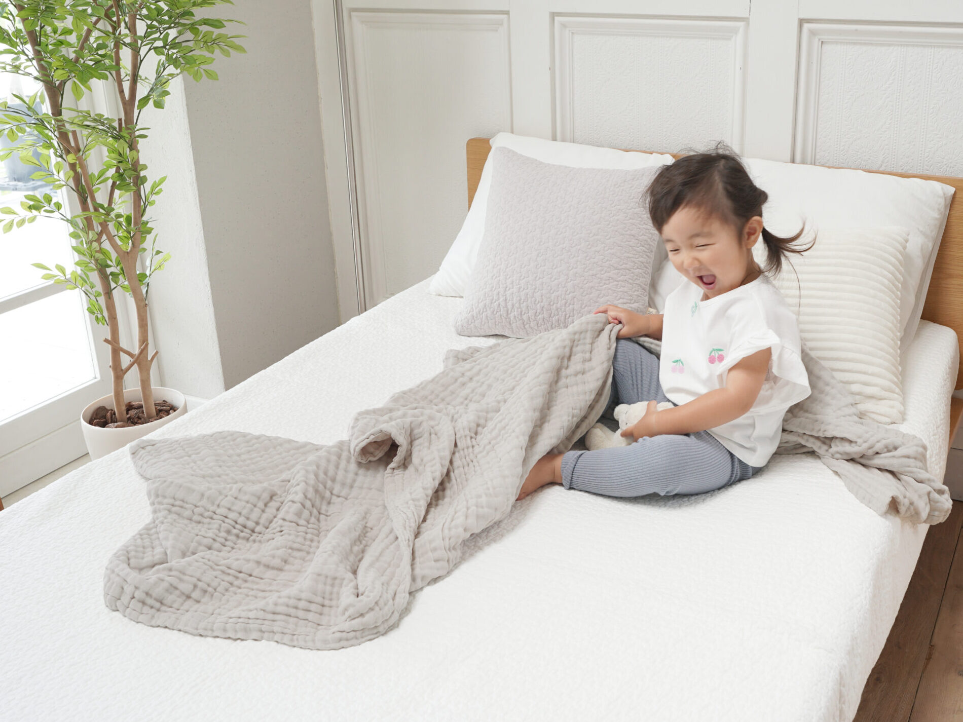 ふんわり、さらり。暑い時期でも心地いいガーゼケット。6枚のガーゼを丁寧に重ねて仕立てたガーゼケットは、吸湿性と通気性に優れ、汗ばむ夜もムレずに快適。夏はさらりと涼しく、冬は掛け布団の下などに使用してあたたかく。1年を通して快適にお使い頂けます。赤ちゃんにも使えるほど優しい素材なので、ご家族みんなで安心してお使い頂けます。